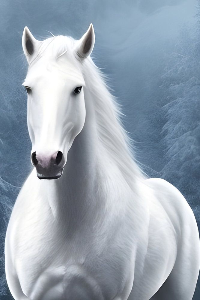 Ein weißes Pferd läuft durch eine wunderschöne Winterlandschaft mit Bergen und verschneiten Bäumen im Hintergrund.