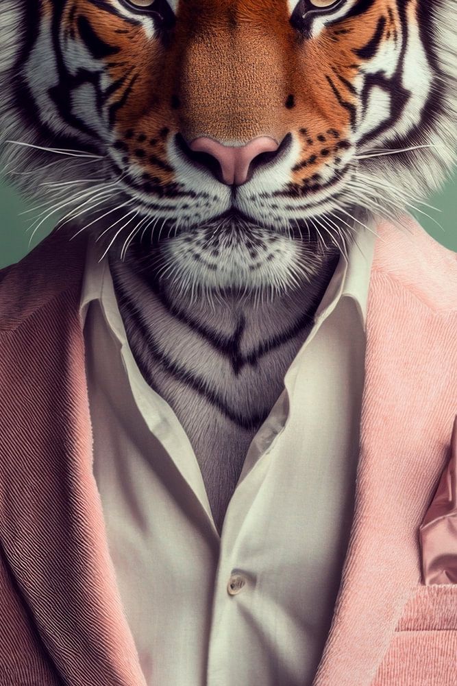 Ein faszinierendes Zusammenspiel von Eleganz und Wildheit strahlt aus diesem Bild. Der Anzug in sanftem Rosé kontrastiert eindrucksvoll mit dem majestätischen Kopf eines Tigers, dessen durchdringender Blick eine Geschichte von Stärke und Anmut erzählt. Hier verschmelzen Mensch und Raubtier zu einer einzigartigen Einheit, die sowohl Stil als auch unbändige Kraft verkörpert.