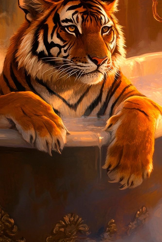 Ein majestätischer Tiger genießt entspannt ein Schaumbad in einer opulenten Badewanne, umgeben von sanften Kerzenlichtern. Der Kontrast zwischen der wilden Eleganz des Tigers und der beruhigenden Atmosphäre sorgt für einen faszinierenden Anblick. Dampf umhüllt die Szene, während die goldenen Akzente des Zimmers einen Hauch von Luxus verleihen. Ein wahrhaft zauberhaftes Moment der Ruhe!
