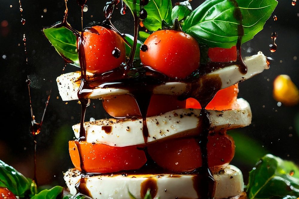 Ein köstliches Farben- und Geschmacksfest entfaltet sich in dieser kunstvollen Komposition aus frischen Tomaten, Basilikum und cremigem Käse. Die dynamischen Tropfen von Balsamico verleihen dem Arrangement eine lebhafte Note. Perfekt für die Küche, inspiriert es zum Kochen und Genießen, während es gleichzeitig die Sinne anregt und für fröhliche Gespräche sorgt.