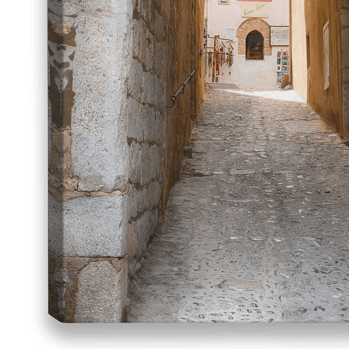 HDR-Foto eines authentischen Tores und der leeren Gasse dahinter, die zum sehenswerten alten Schloss in der Stadt Ibiza auf der geliebten Insel Ibiza gehören.