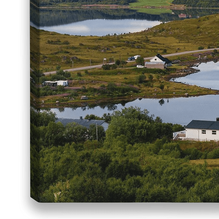 Blick auf eine weite Landschaft vom Pass Torvdalshalsen auf den Lofoten in Norwegen. An einem sonnigen Tag blicken wir auf eine Kirche, ein kleines Dorf und das ruhige Wasser eines kleinen Sees, in dem sich die fernen Berge wunderbar spiegeln.