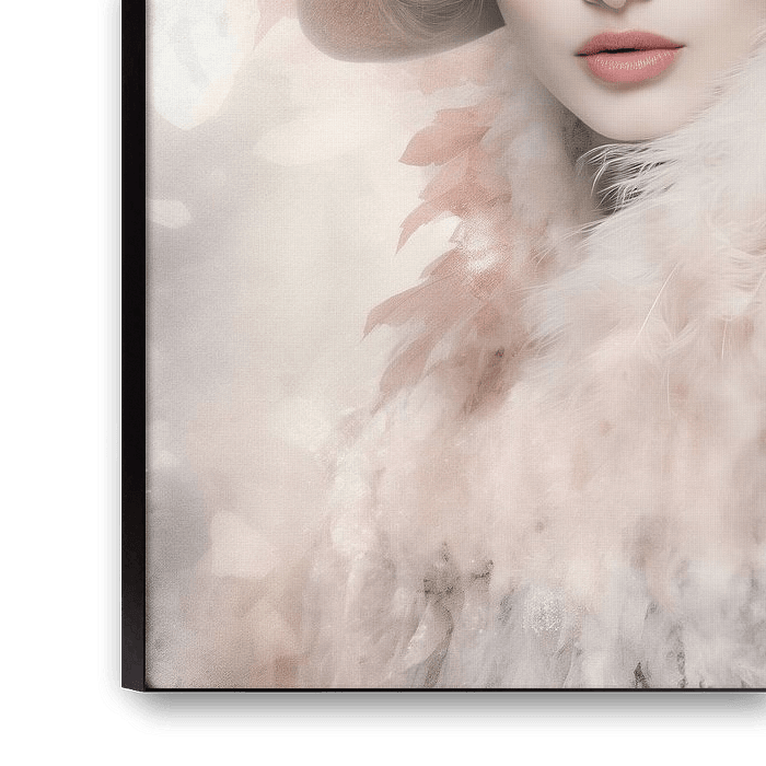 Das Werk zeigt das Porträt einer jungen Frau, die in eine Atmosphäre aus weichen Pastelltönen gehüllt ist, die eine romantische und verträumte Qualität ausstrahlen. Im Mittelpunkt steht das Gesicht der Frau mit seinen sanften, den Blick fesselnden Augen und zart geformten Lippen. Die Wahl einer hellen Palette von Rosa- und Beigetönen in Kombination mit den Blumen- und Federornamenten ihres Hutes und ihrer Kleidung weckt Assoziationen an einen Frühlingsmorgen. Diese Ästhetik wird durch einen sanften Schleier verstärkt, der sich über das Bild legt, als ob der Moment in einem ruhigen, fast zeitlosen Raum eingefangen wurde.