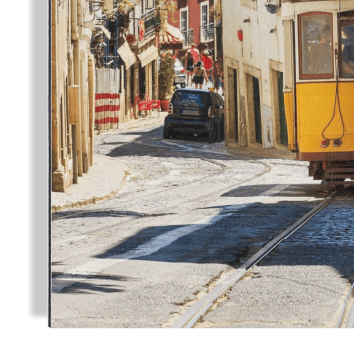 Schöner Schuss einer traditionellen gelben Tram in den schmalen steilen Straßen von Lissabon, Portugal