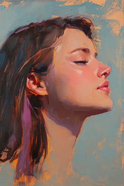 Ein sanfter Ausdruck von Ruhe und Selbstvertrauen erstrahlt in zarten Farbnuancen. Das Licht küsst das Profil, während die Haarsträhnen spielerisch im Wind verwehen. Dieses eindrucksvolle Kunstwerk bringt eine harmonische Atmosphäre ins Schlafzimmer und lädt zur Entspannung ein, perfekt für Momente der Besinnung und inneren Einkehr.