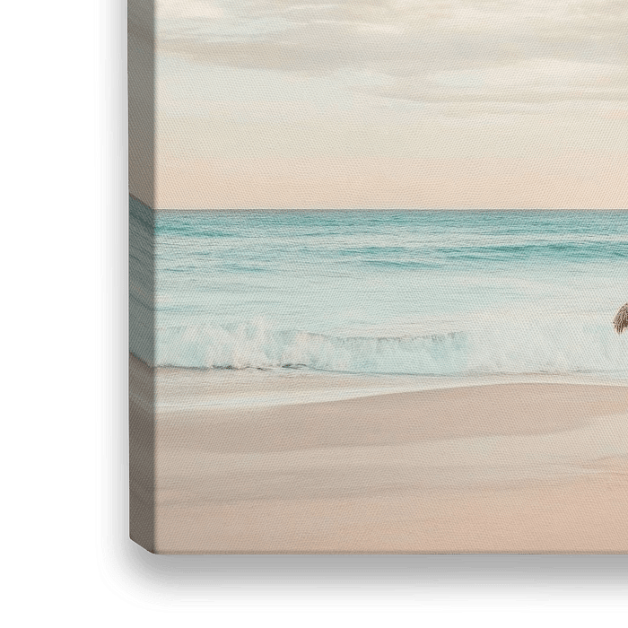 In sanften Pastelltönen schimmert der Horizont, während sanfte Wellen den sandigen Strand umspielen. Ein einsamer Sonnenschirm, mit seinem natürlichen Strohdach, lädt zum Verweilen und Träumen ein. Die ruhige Atmosphäre vermittelt ein Gefühl von Freiheit und Entspannung—ein wahrhaft idyllischer Moment, eingefangen zwischen Himmel und Meer.