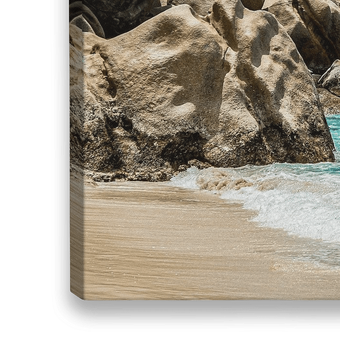Eine kleine Bucht im Insel-Paradies der Seychellen, inmitten des Indischen Ozeans. Blauer Himmel, glasklares türkisfarbenes Wasser, gelber Strand mit feinem Sand, Felsen, Steine und üppige grüne tropische Vegetation im Hintergrund. Das ist der Traumstrand Anse Georgette auf der Insel Praslin.