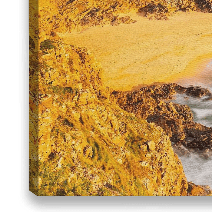 Ein traumhafter und versteckter Küstenabschnitt von Irland wird in das goldene Licht der untergehenden Sonne getaucht.