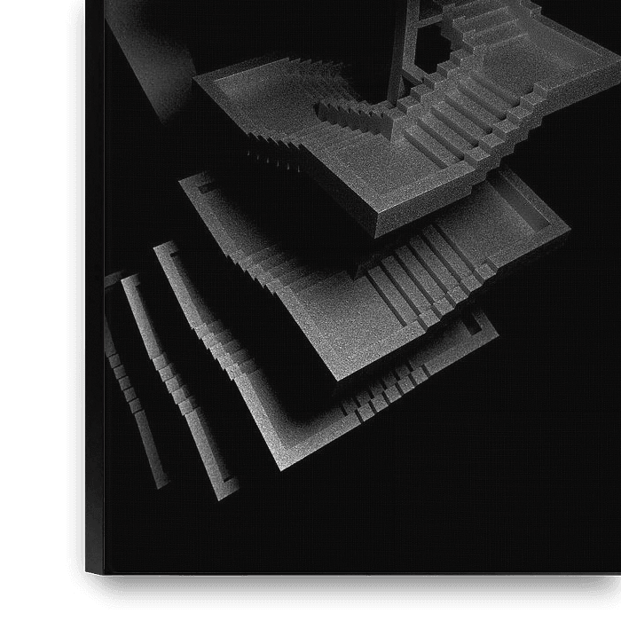 Eine unendliche Treppe als Laufrad einer Tretmühle. Schwarz-Weiß-Bild.