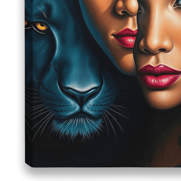Portrait > Trilogie der Diversität > Dieses Bild zeigt einen Mann asiatischer Herkunft und eine Frau, die Indianerin sein könnte, wie einen schwarzen Panther (auch Jaguar). Die Frau und der Mann haben beide blaue Augen, was ihre Schönheit noch mehr hervorhebt. Zusammen bilden sie eine Einheit von Schönheit und Diversität. >…