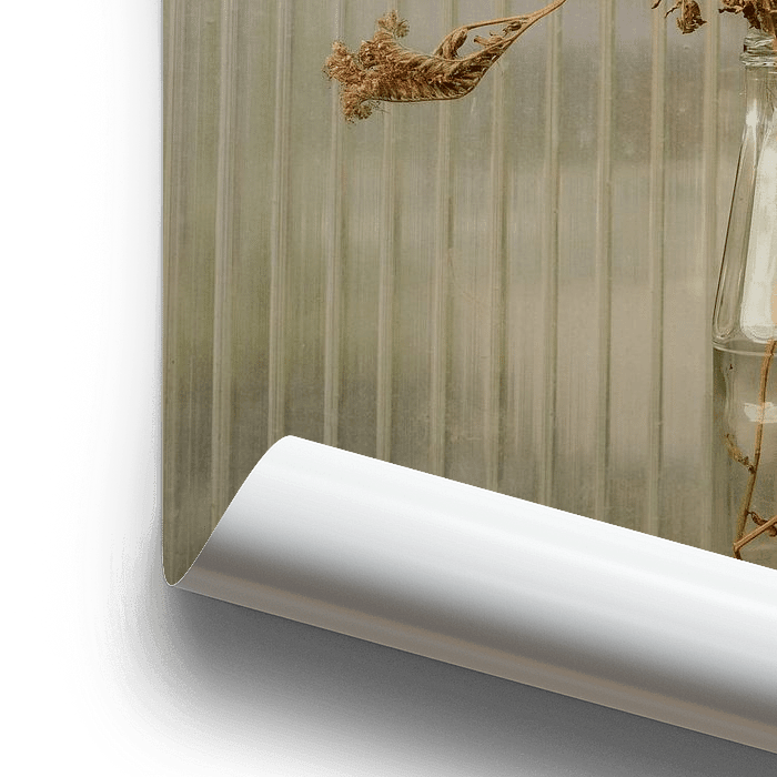 Eine klare und eine dunkelbraune Flasche halten zarte Trockenblumen vor einer transluzenten Gewächshauswand. Warme, neutrale Farbtöne und eine reduzierte Komposition erzeugen Ruhe und Poesie. Ein zeitloser Druck für Küche, Esszimmer, Atelier oder Café – für Fans von Slow Living und botanischer Ästhetik.