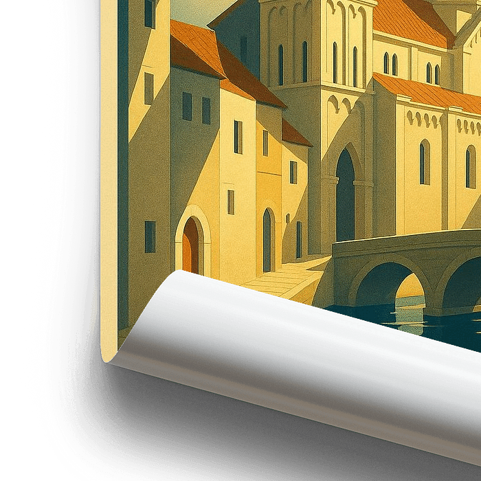 Dieses Art-Déco-Poster von Trogir zeigt die beeindruckende mittelalterliche Kathedrale und den Glockenturm, die in goldene Sonnenstrahlen getaucht sind. Das Kunstwerk fängt die Harmonie der steinernen Bögen, Kuppeln und Türme ein, die sich in den ruhigen Gewässern darunter spiegeln. Mit einer raffinierten Farbpalette aus elfenbeinfarbenem Weiß, warmen Terrakottatönen und tiefen Blautönen spiegelt das Design den Charme des kroatischen Adriatischen Erbes wider. Inspiriert von der Eleganz alter Reiseplakate, kombiniert dieses Werk stilisierte Geometrie mit strahlendem Licht und zelebriert die einzigartige Atmosphäre von Trogir. Dieser Druck ist ideal für Liebhaber von Architektur, Geschichte und mediterranen Städten und bringt sowohl Raffinesse als auch Nostalgie in jeden Raum. Das Kunstwerk lädt Sie dazu ein, sich vorzustellen, wie Sie durch die engen Gassen von Trogir schlendern, romanische und gotische Details entdecken oder den Sonnenuntergang über der Adriaküste beobachten. Als zeitloses Sammlerstück ist dieses Trogir-Poster perfekt für Kunstliebhaber, Reisende und alle, die sich von der Romantik der europäischen Küstenstädte angezogen fühlen.
