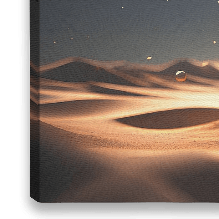 Das digitale Kunstwerk zeigt einen Tropfen Lebenswasser, der einer Welt ihr erstes Leben schenkt. Eine karge, sandige Ebene wird durch Wasser mit Lebenselixier zu einer lebendigen Welt. Sand vermischt sich mit Wasser, Luft und Feuer aus dem Kosmos.