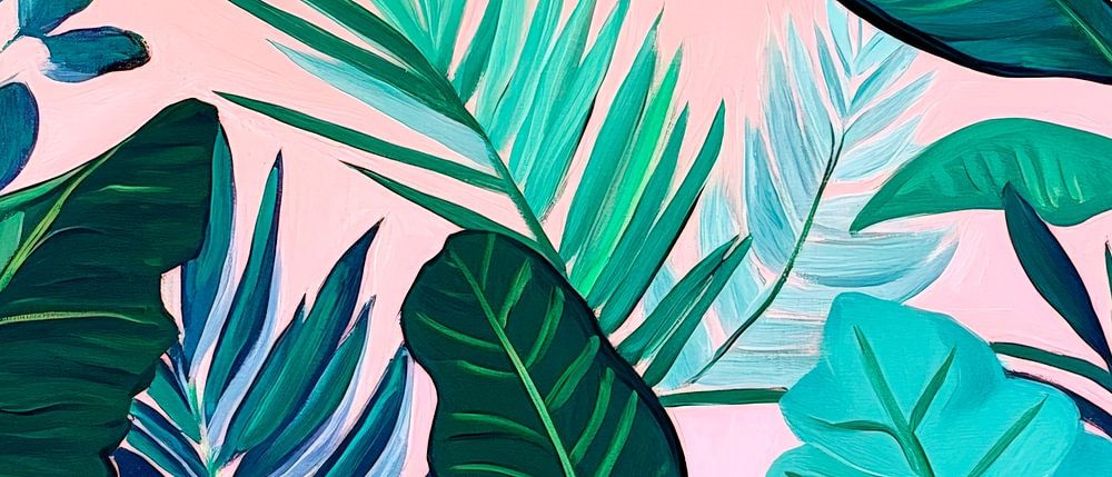Ein üppiges Blättermeer in vielfältigen Grüntönen, harmonisch kontrastiert von einem sanften rosafarbenen Hintergrund, vermittelt ein Gefühl von Frische und Lebensfreude. Perfekt für das Wohnzimmer, bringt es eine beruhigende, natürliche Atmosphäre, die zum Entspannen und Verweilen einlädt. Ein idealer Blickfang, der Schwung und Eleganz verkörpert.