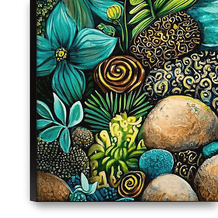 Dieses farbenfrohe Design bringt die Natur mit einem schönen Zusammenspiel aus einem fließenden Fluss, bunten Steinen und üppigem Grün ins Haus. Die detaillierten Pflanzen und Blumen vermitteln ein tropisches und beruhigendes Gefühl. Ideal als Wanddekoration, um eine einzigartige und natürliche Atmosphäre in jedem Raum zu schaffen.…