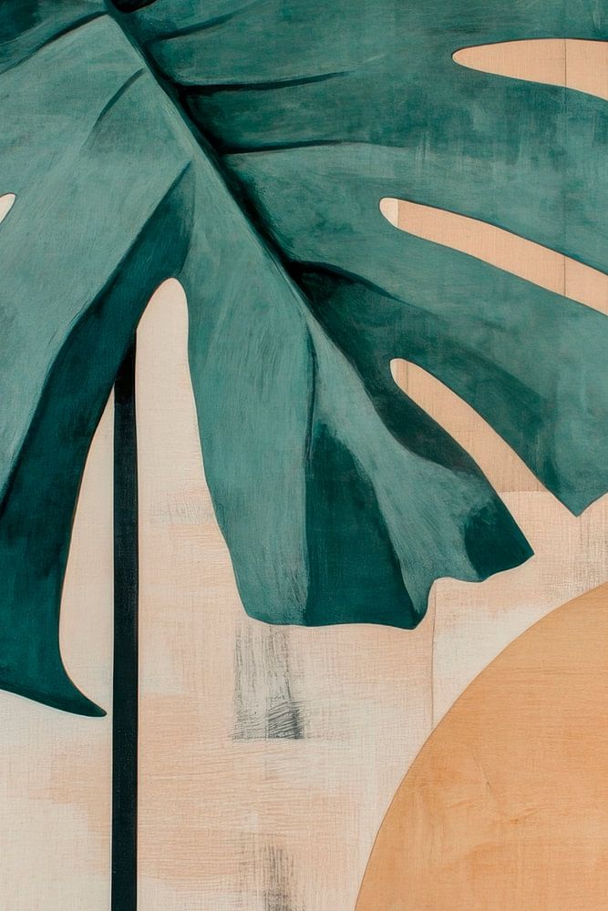 Ein harmonisches Spiel aus lebhaften Grün- und Erdtönen entfaltet sich in einem kunstvollen Zusammenspiel. Die stilisierte Monstera-Blattform gleicht einem aufregenden Akzent, der Frische und Leben ausstrahlt. Diese klare, moderne Komposition fügt sich perfekt in ein Wohnzimmer ein und schafft eine einladende, entspannte Atmosphäre.