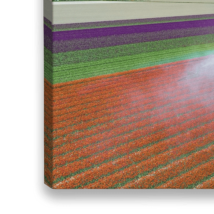 Bestelle dieses Blumen-Wandbild Tulpen auf einem Feld, das mit einer landwirtschaftlichen Beregnungsanlage besprüht wird von Sjoerd van der Wal Fotografie als Reproduktion auf Leinwand, Alu-Dibond, als Poster, Fototapete oder Acrylglasbild.