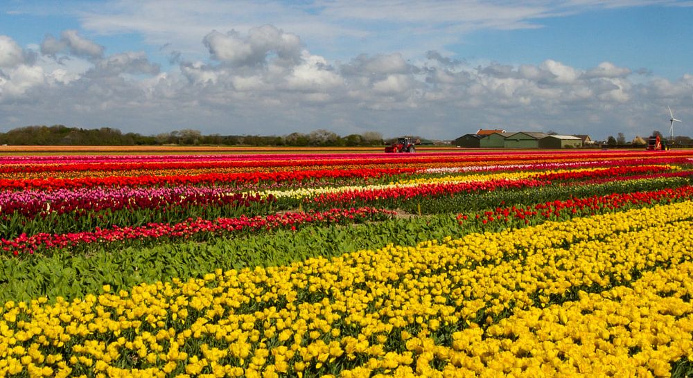 An einem schönen Tag im Frühling, mit einem blauen Himmel und etwas schönem Sonnenschein, sehen die Farben dieser Tulpen schön aus. Das Foto wird in Nordholland gemacht.