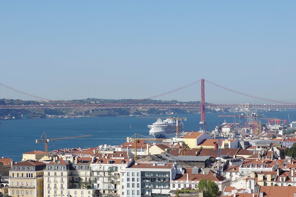 Aussicht über Lissabon vom "Castelo de São Jorge" mit dem Fluß Tejo und der Hängebrücke "Ponte 25 de Abril".