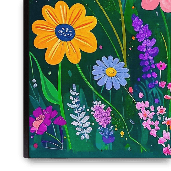 Die verwendeten Farben sind warm, wie Gelb, Orange, Rot, Rosa und Lila für die Blumen, die einen schönen Kontrast zu den kühleren Tönen im Hintergrund bilden.