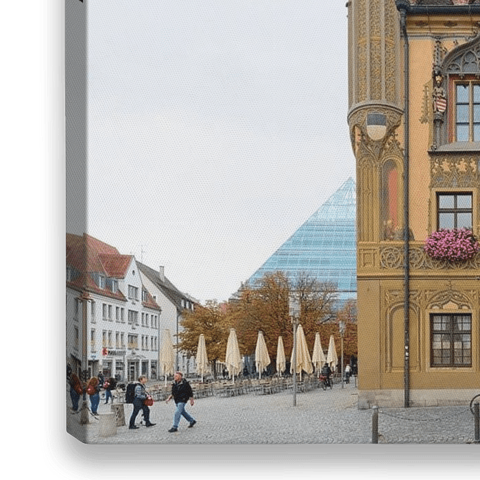 Vom 14. bis 16. Jahrhundert entstand das außergewöhnlich opulent gestaltete Ulmer Rathaus. Hier sehen Sie die Ostseite in einer Streetline Komposition aus mehreren Einzelaufnahmen. Ein Werk aus dem PanoramaStreetline Bildarchiv.