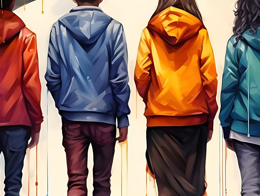 Im strömenden Regen gehen vier junge Menschen unter einem bunten Regenschirm die Straße entlang. Sie strahlen Unbekümmertheit aus und bleiben dicht beieinander, ein Leuchtfeuer der Freundschaft und Unterstützung.