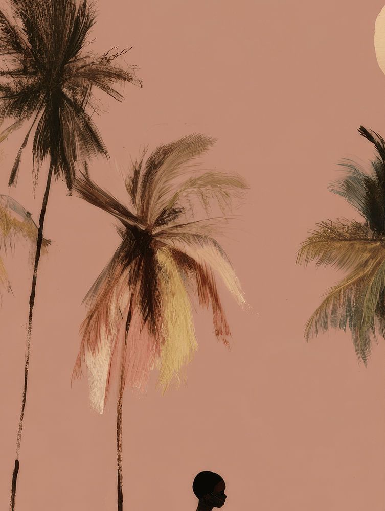 Eine minimalistische tropische Szene mit einer silhouettierten Figur unter hohen, sich wiegenden Palmen. Die warmen Sand- und Rosttöne, kombiniert mit dem zarten Rosa des Himmels, schaffen eine heitere Urlaubsatmosphäre. Ein zeitloses Kunstwerk, das Ruhe und Wärme in jedes Interieur bringt.
