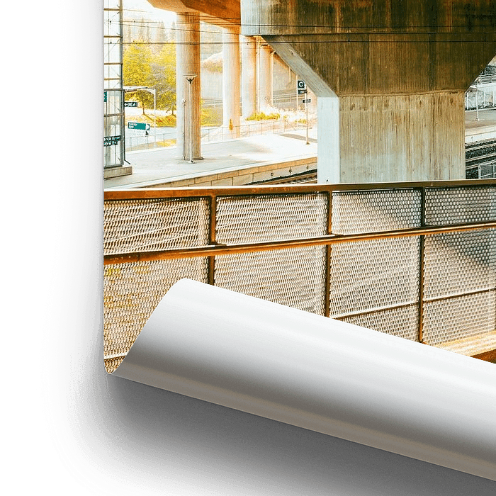 Klare Geometrie trifft warme Sonne: ein Bahnhof unter einer Brücke, Decke voller Rohre, massive Betonpfeiler und ein Metallgeländer mit harten Schatten. Das Licht formt die Infrastruktur zur Skulptur. Markanter Fotodruck für Lofts, Büros und Ateliers – für Fans von Architektur, Bahn und industrieller Ästhetik.