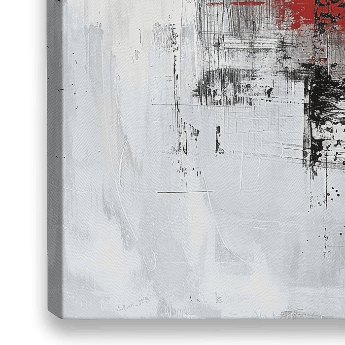 Urban Pulse - Dieses abstrakte Gemälde zeigt eine dynamische Komposition mit dominanten Grau- und Schwarztönen, die von intensiven Rot- und Weißtönen unterbrochen werden, die einen starken visuellen Kontrast bilden.