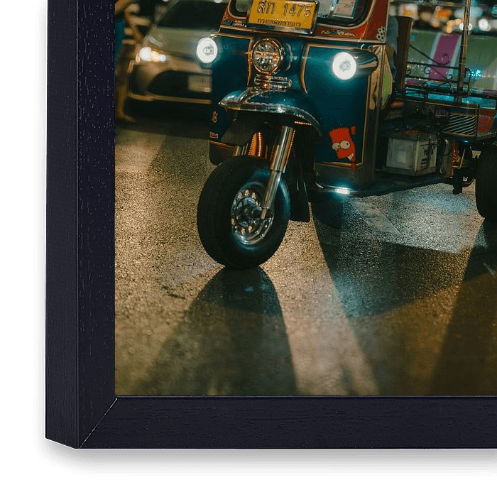 Dieses Bild zeigt ein detailreiches Tuk Tuk, das ikonische Dreirad-Taxi, bei Nacht im Zentrum von Bangkok. Die Szene ist geprägt von bunten Lichtern, leuchtenden Reklametafeln und dem lebendigen Treiben der asiatischen Großstadt. Die eindrucksvolle Beleuchtung und die Reflexionen auf der nassen Straße unterstreichen das urbane Flair und den ganz besonderen Charakter Bangkoks, einer Stadt, die niemals schläft. Tuk Tuks sind ein unverwechselbares Symbol thailändischer Mobilität und stehen für Spontaneität, Abenteuer und das typische südostasiatische Straßenleben. Im Hintergrund sorgen die vertrauten Farben und Schilder dafür, dass die Dynamik und Vielfalt der Metropole spürbar werden. Dieses Motiv ist ideal für Fans von Urbanität, Street Photography und Asienreisen. Als Wandbild bringt es Energie, Lebensfreude und den einzigartigen Rhythmus Bangkoks in den Wohnraum, ins Büro oder Café und ruft Erinnerungen an spannende Nächte in Thailands Hauptstadt wach.