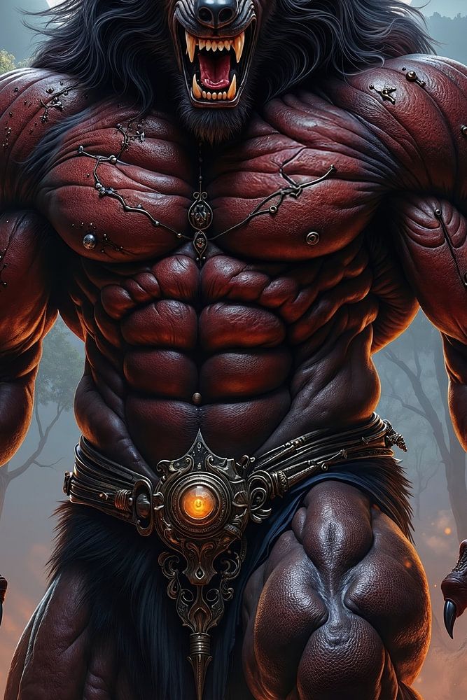 Zwischen brennenden Baumstämmen erhebt sich eine monströse Gestalt aus Fell, Muskeln und glühendem Zorn. Der Werwolf steht frontal im Wald, sein Körper von Feuer und Asche umgeben, während der volle Mond wie ein kaltes Urteil hinter ihm aufsteigt. Leuchtende Augen und gefletschte Reißzähne durchbrechen die Dunkelheit der…