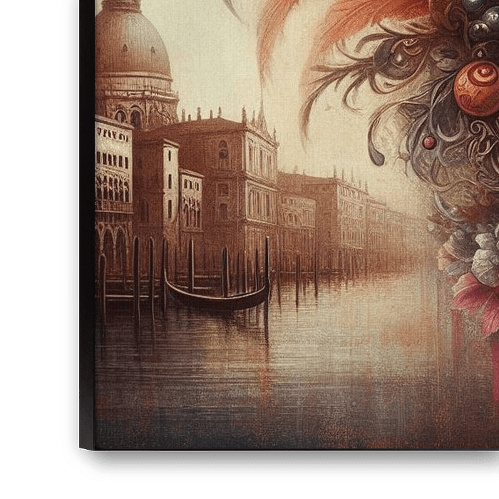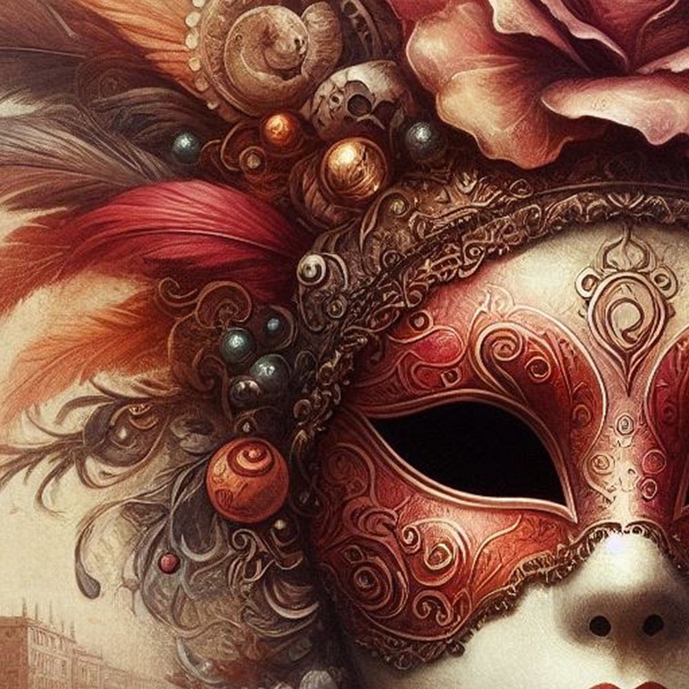 Ein digitales Kunstwerk einer venezianischen Maske, die traditionell im Karneval getragen wird. Sie ist in einem Vintage-Stil gehalten, der an alte klassische Gemälde erinnert. Die Maske ist mit Perlen, großen Federn und Blumen verziert. Die warmen Farben Gold, Bronze und Rot verleihen Ihrem Interieur eine schicke Note.