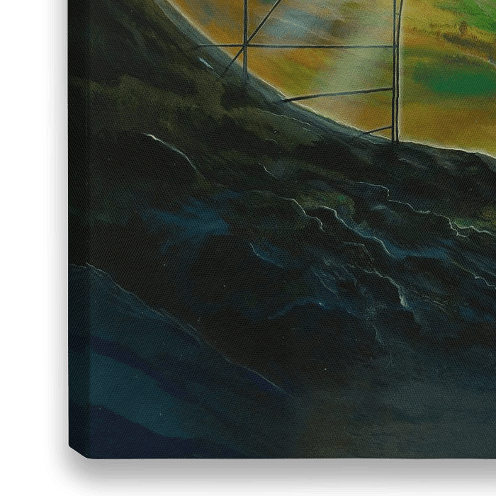 Dieses Gemälde offenbart eine faszinierende Landschaft, die den Betrachter in eine Welt voller Kontraste und Möglichkeiten entführt. Im Vordergrund erstreckt sich eine dunkle, felsige Erde, die beinahe surreal und unwirtlich wirkt. Ein düsterer Teich ohne jegliche Spiegelung verstärkt das Gefühl der Abgeschiedenheit und Verlassenheit.…