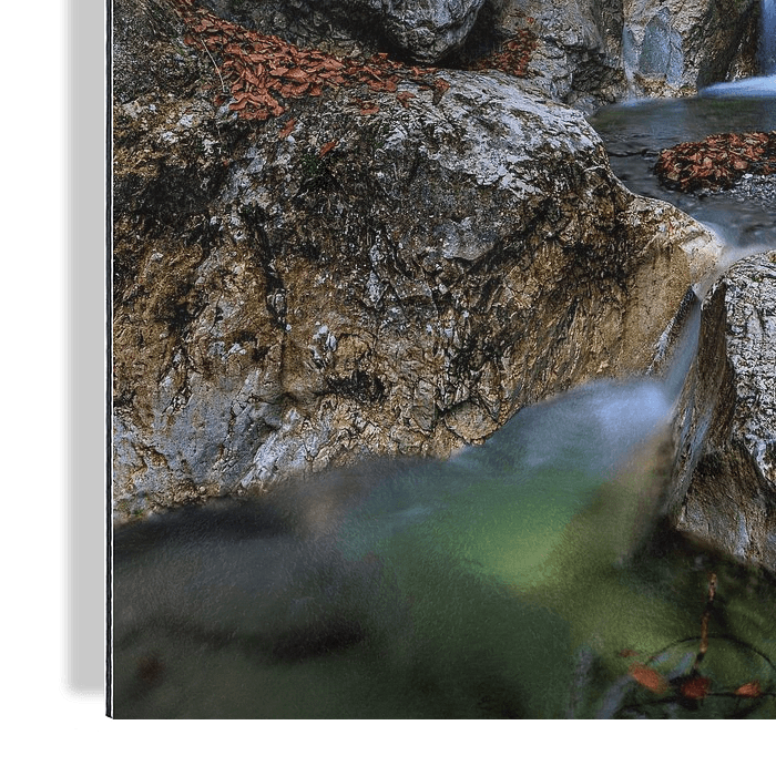 In sanftem Strom fließt das Wasser über die glatten Steine und sammelt sich in einem kleinen, von Laub umrahmten Becken, bevor es sich weiter durch die zerklüftete…