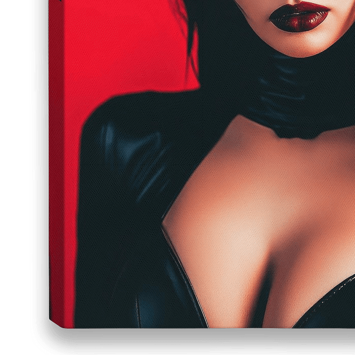 Ein faszinierendes Spiel aus Schatten und Licht strahlt aus diesem Bild, wo eine geheimnisvolle Figur mit Katzenohren und glänzender, schwarzer Haut vor einem leidenschaftlichen roten Hintergrund steht. Ihre kühne Ausstrahlung, gepaart mit hypnotisierenden Lippen, verleiht jedem Raum einen Hauch von Erotik und Spannung – perfekt für ein…