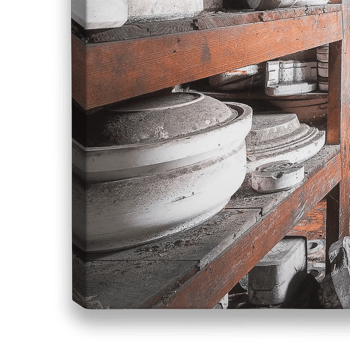 Dies ist ein Bild einer schönen kleinen verlassenen Keramikfabrik oder Töpferei. Viele Lagerbestände und Gussformen bleiben zurück. Das Gebäude befindet sich in starkem Verfall und wird voraussichtlich nicht sehr lange halten.