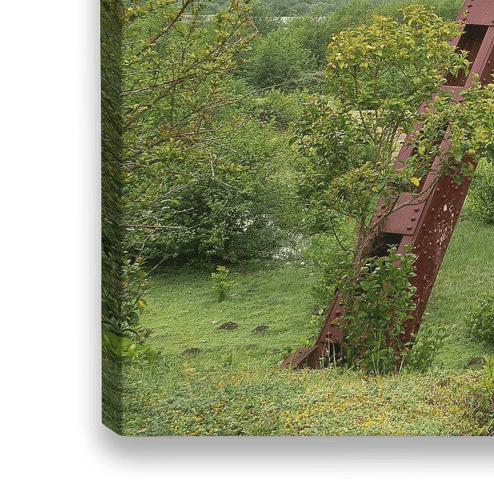 Dies ist ein Bild einer verlassenen und stark beschädigten Eisenbahnbrücke. Die Brücke wurde während des Krieges im Land beschädigt. Auf den ersten Blick liegt die Brücke mitten im Nirgendwo.