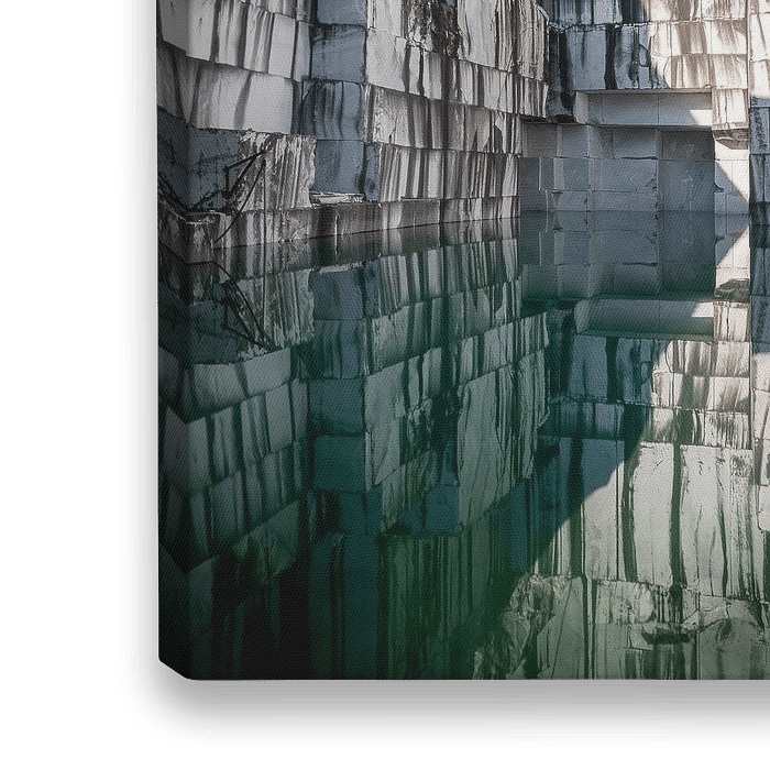 Dies ist ein Foto eines Marmorsteinbruchs (Carrara) mit einer atemberaubenden Reflexion durch das Wasser am Boden. Vor Jahren blockierte der Fund von Alpensalamandern die Ausgrabung im Steinbruch. Alpensalamander sind wenige Zentimeter große Amphibien, die durch den WWF geschützt sind.