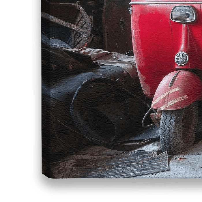 Dies ist ein Bild eines roten Piaggio, der in einer Garage zurückgelassen wurde. In dieser Garage sind noch eine Reihe weiterer Autos untergebracht. Alle nicht mehr in Gebrauch.