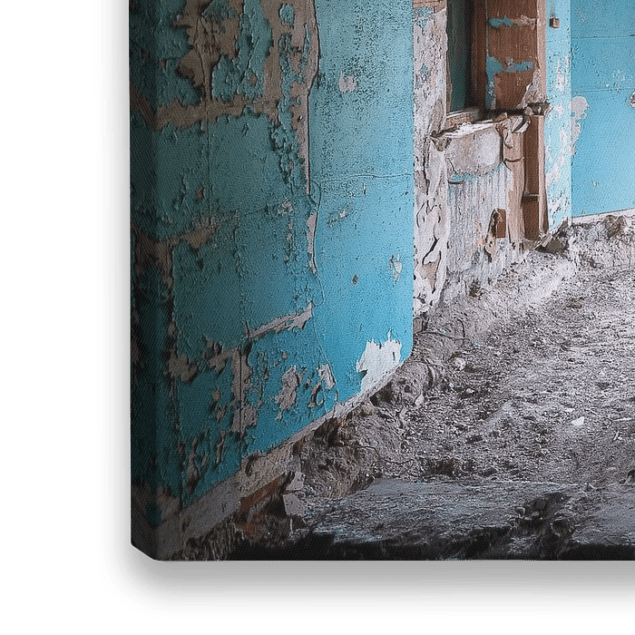 Dies ist ein Bild eines kleinen blauen Zimmers, das ich in einem riesigen, verlassenen Sanatorium fotografiert habe. Das Dach spiegelt die beeindruckende Architektur des Gebäudes wider.