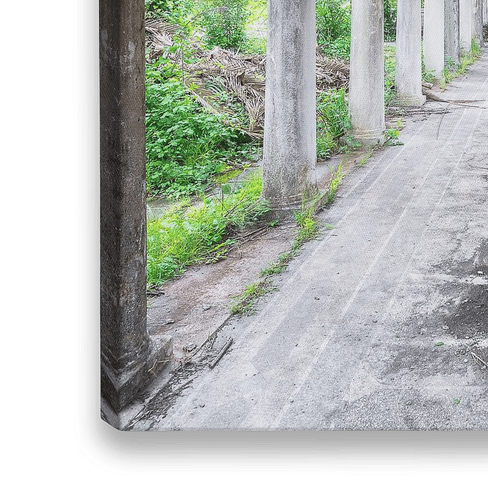Dies ist ein Foto eines schönen, verlassenen und baufälligen Korridors, der Teil eines Bahnhofs ist und vollständig von der Natur übernommen wurde.