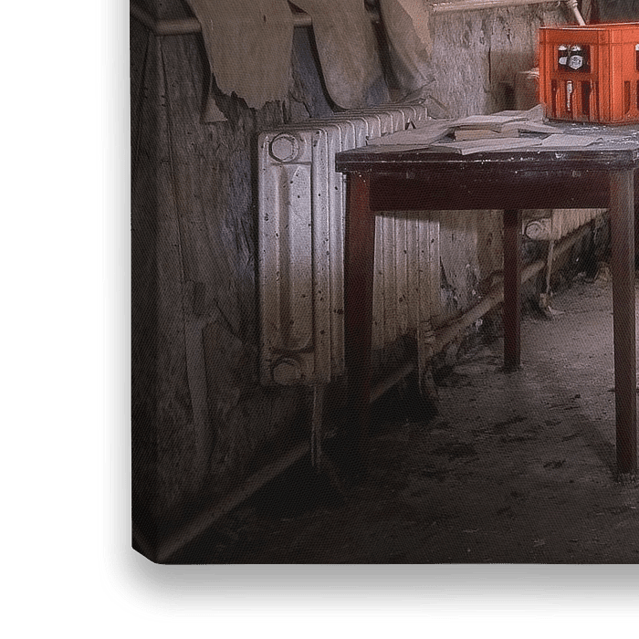 Dieses ist eine Fotografie eines verlassenen Rollens auf einem sehr großen Gelände, das in schweren Verfall gefallen ist. Das Zimmer war komplett dunkel als ich es betrat.