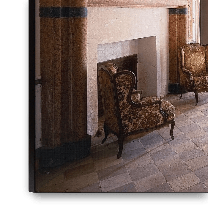 Dies ist ein Bild eines schönen Raumes in einem verlassenen Schloss. Die Detailgenauigkeit der Dekoration in diesem Raum ist erstaunlich. Andere Räume im Schloss waren leer oder mit Werkzeugen und Materialien gefüllt, um den Ort zu renovieren. Allerdings war alles mit einer dicken Stoffschicht bedeckt ...
