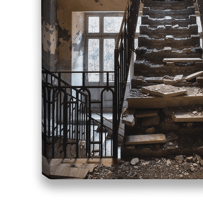 Dies ist ein Foto von einer schönen Treppe in einem der Gebäude eines verlassenen Sanatoriumskomplexes. Der Bau des Komplexes begann in den 1930er Jahren. In den 1960er Jahren, nachdem die Behandlung der Tuberkulose mit Penicillin viel wirksamer wurde, wurde der Komplex geschlossen. Seitdem sind die Gebäude verlassen und baufällig geworden. Wegen der "Regeln" des architektonischen Erbes wurde jedes Projekt oder jeder Verkauf zur Arbeit an dem Komplex gestoppt.