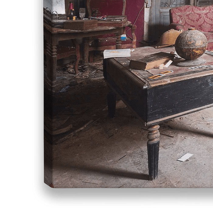 Dies ist ein Foto des Wohnzimmers in einem verlassenen Schloss. Die Burg wurde im 18. Jahrhundert erbaut. Während des Ersten Weltkriegs wurde die Burg von Deutschen besetzt und durch Bombenangriffe beschädigt. Nach dem Weltkrieg wurde die Burg restauriert. Am Ende des 20. Jahrhunderts wurde die Burg verlassen und ihr jetziger Zustand ist sehr schlecht.