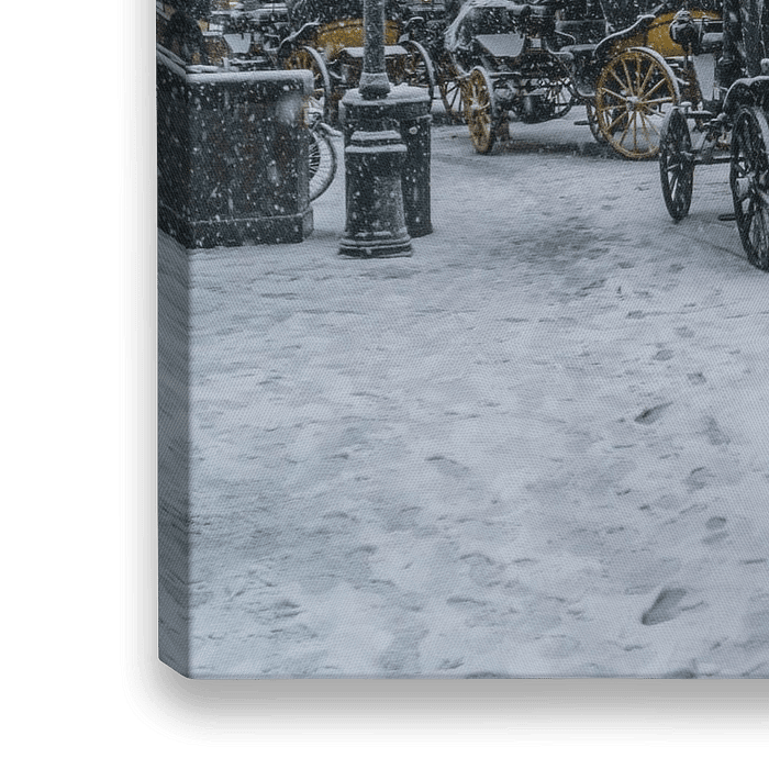 Schneebedeckte Wagen während eines winterlichen Schneeschauers in Brügge, Belgien. Starker Schneefall über der Kutsche. Im Hintergrund die Gebäude von Brügge.