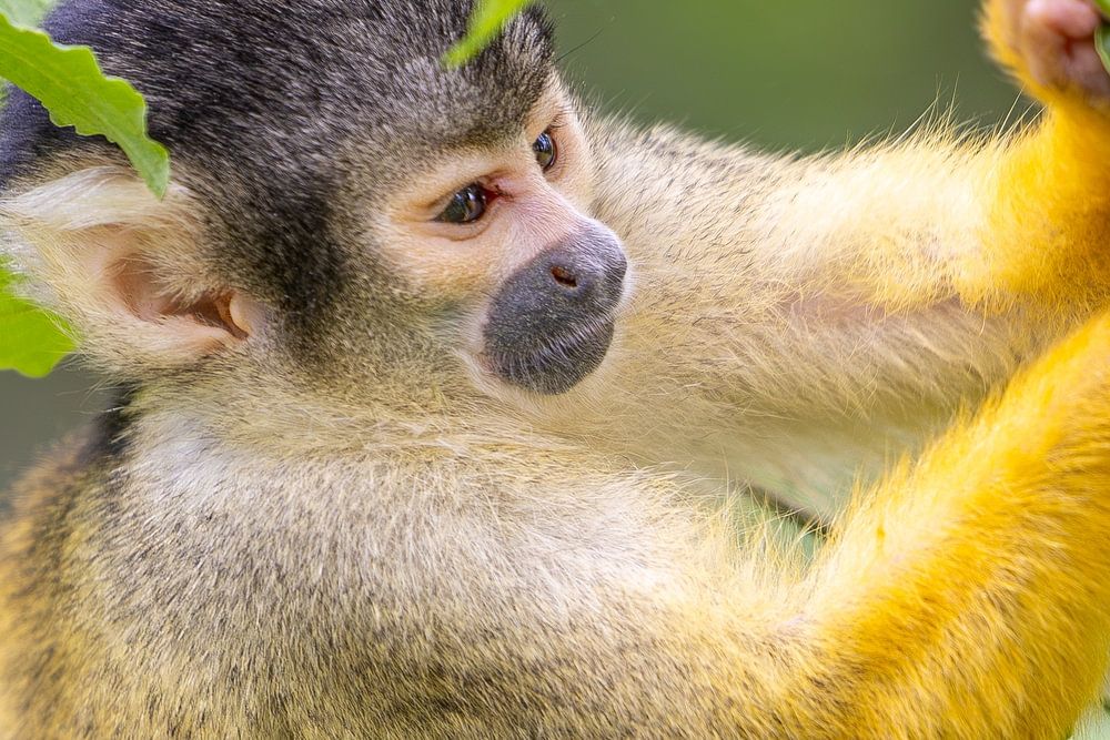 Dieses schöne Foto zeigt ein verspieltes Totenkopfäffchen inmitten seines natürlichen Lebensraums. Das Äffchen mit der charakteristischen schwarzen Gesichtsmaske und den leuchtend gelben Gliedmaßen ist damit beschäftigt, nach Blättern auf einem Ast zu schnappen. Die leuchtenden Farben seines Fells und die umgebenden grünen Blätter sind wunderschön eingefangen und erzeugen ein dynamisches und lebendiges Bild. Die Details in der Textur seines Fells und die Schärfe seines Griffs nach den Blättern verleihen dem Foto einen realistischen und intimen Charakter.