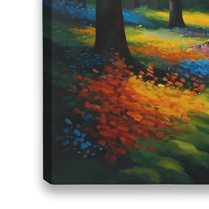 Treten Sie ein in eine Welt, in der die Farben regieren und die Natur herrscht. Dieses moderne Kunstwerk nimmt Sie mit auf eine visuelle Reise entlang eines gewundenen Pfades durch einen lebendigen Wald. Impressionistische Pinselstriche erwecken die Szene zum Leben, mit einer Palette, die alle Schattierungen des Regenbogens umfasst. Es…