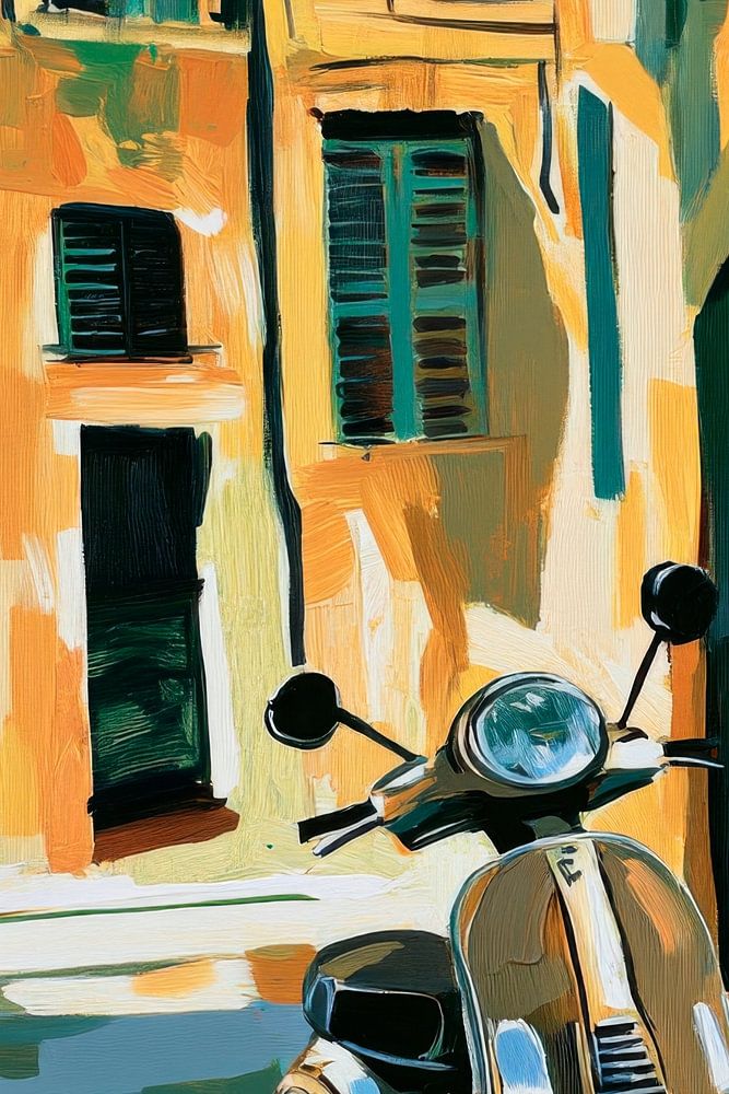 In einem sonnendurchfluteten Gassenlabyrinth aus warmen Gelbtönen wartet ein eleganter Roller, bereit für Abenteuer. Umgeben von historischen Mauern und einem Hauch mediterraner Flora, strahlt er einen einladenden Charme aus. Die Schatten tanzen sanft auf dem Boden und verleihen der Szene eine lebendige Atmosphäre, in der jeder Moment zum Erkunden einlädt.