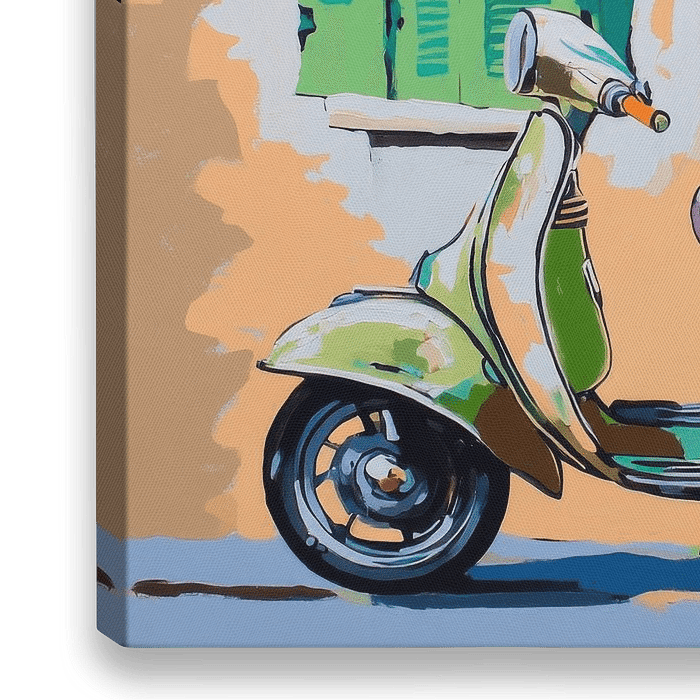 Bestelle dieses Popart-Wandbild Vespa vor Fenstern von Poster Art Shop als Reproduktion auf Leinwand, Alu-Dibond, als Poster, Fototapete oder Acrylglasbild.